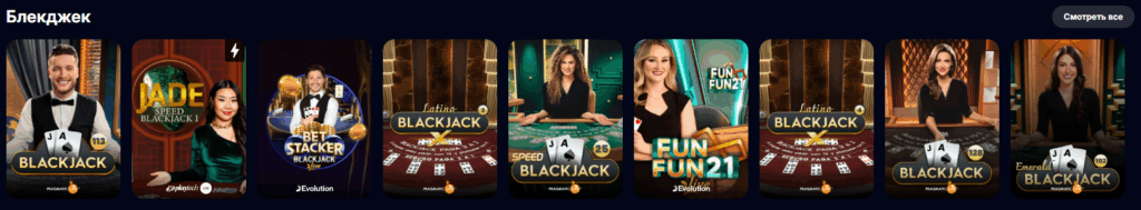 - Блэкджек. Несколько типов столов с разными лимитами ставок. Есть быстрые раунды, VIP-версии и инновационные форматы с дополнительными ставками.