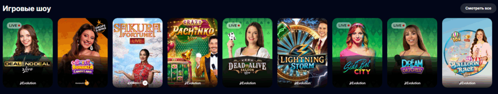 - Шоу-игры. Современные интерактивные форматы, объединяющие азарт и визуальные эффекты: Crazy Time, Monopoly Live, Deal or No Deal, Dream Catcher.