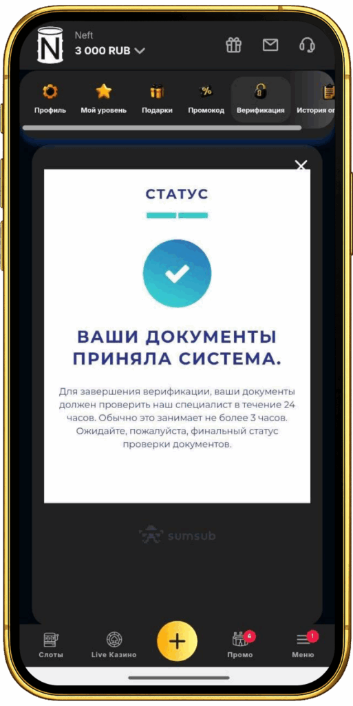 Проверка документов занимает от 1 до 24 часов. После одобрения статус профиля меняется на «Подтвержденный», а все ограничения на вывод и бонусные операции снимаются.